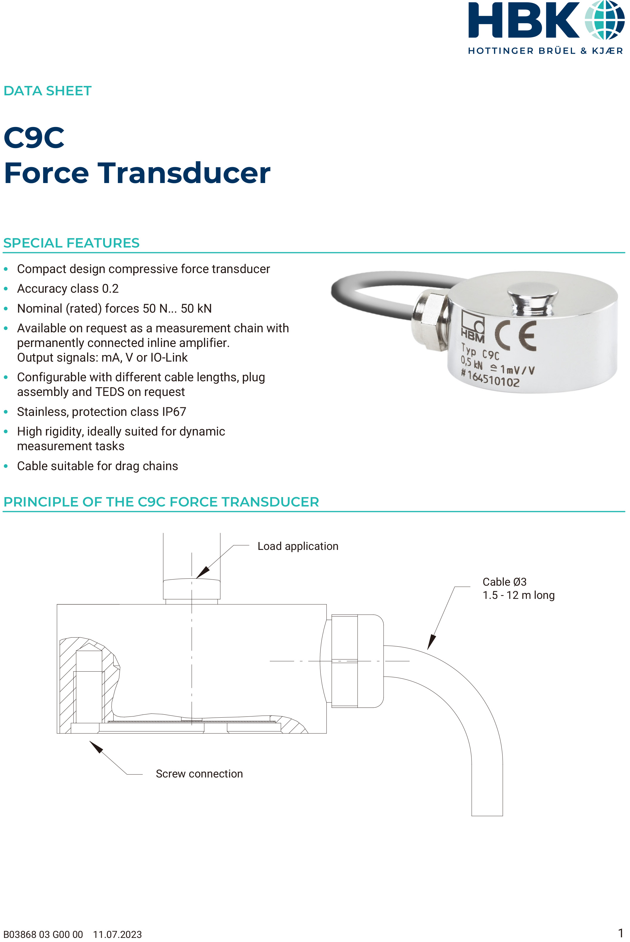 HBM C9C测力传感器:微型测力传感器,用于压向力测量