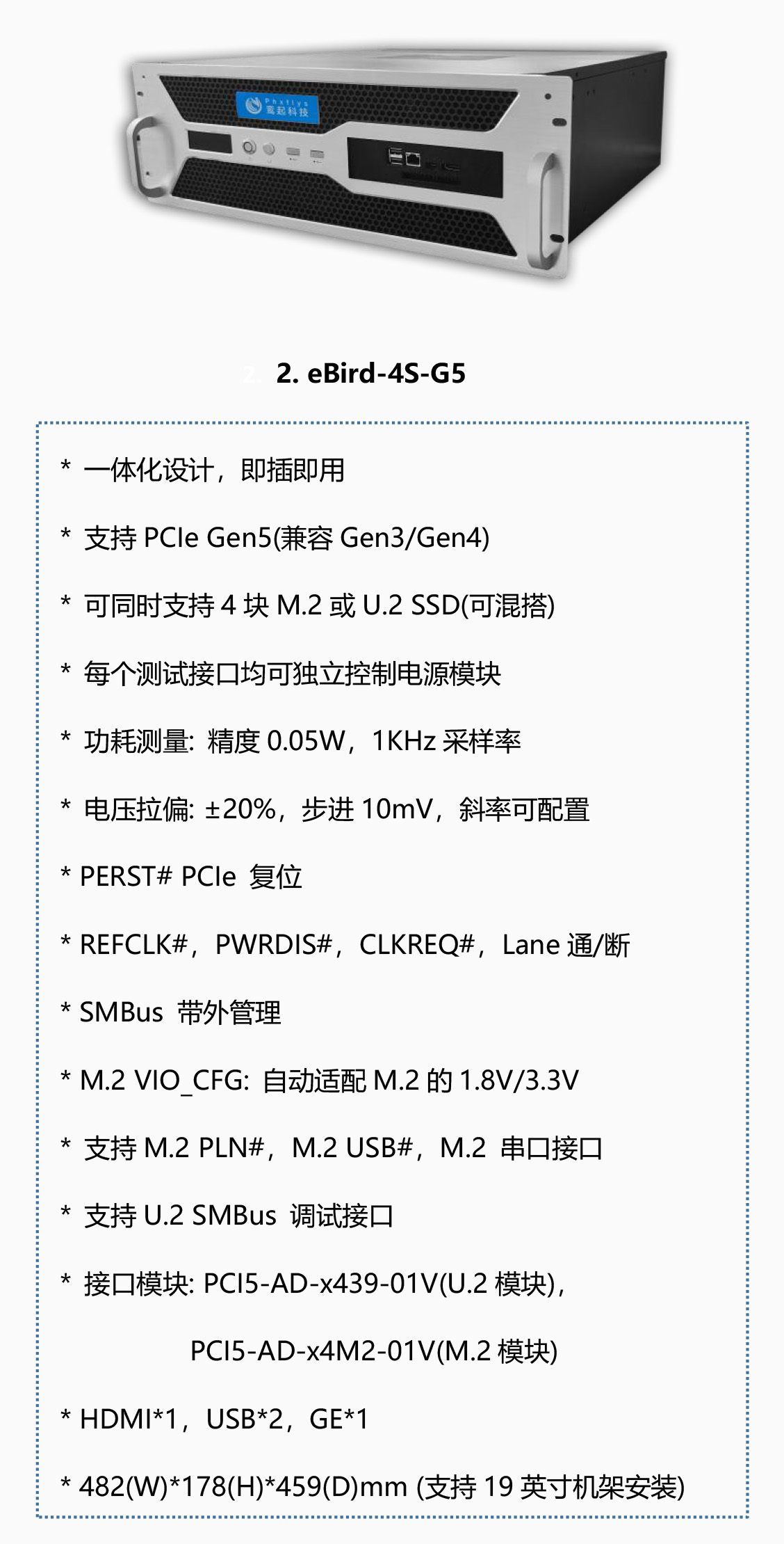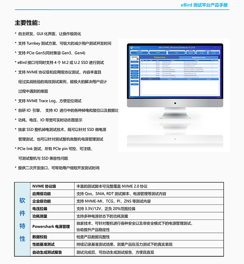 eBird测试平台是一个支持现行的PCI-Express协议(支持Gen5),专业且强大的国产测试系统,专为固态硬盘的测试而生。