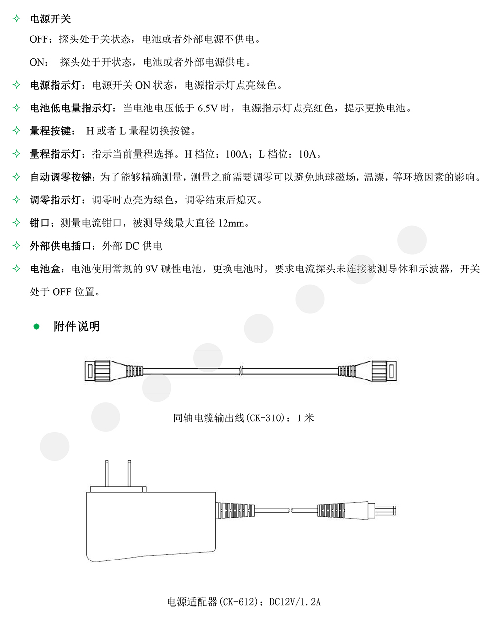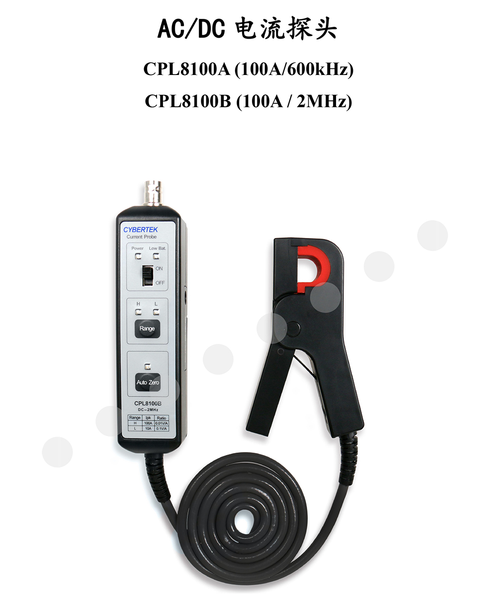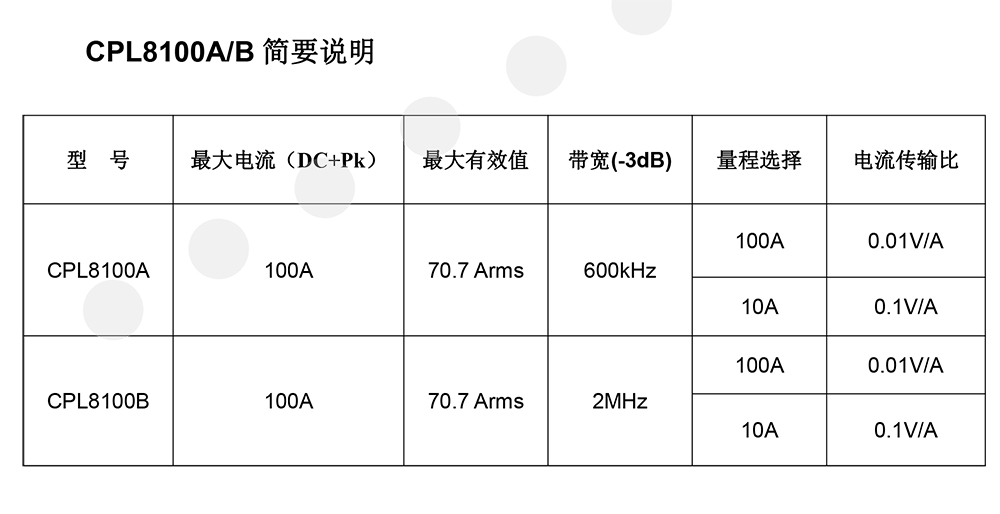 CPL8100A/B是一款能够同时测量直流和交流的电流探头。测量电流100A峰值(70.7A RMS),CPL8100A带宽为600kHz(-3dB),CPL8100B带宽为2MHz(-3dB)。提供两个量程切换(10A和100A档位),根据电流大小选择合适量程;具有自动调零功能,使用方便;带有电源和电池低电压报警指示灯,过载报警声;可使用电池供电或者外部电源供电,使得测量更加方便;标准的BNC输出接口,方便和示波器等其它设备的连接,可使用BNC转双香蕉插头连接万用表测量AC和DC电流。通常用于工频测量﹑电机驱动﹑电源等场合。
