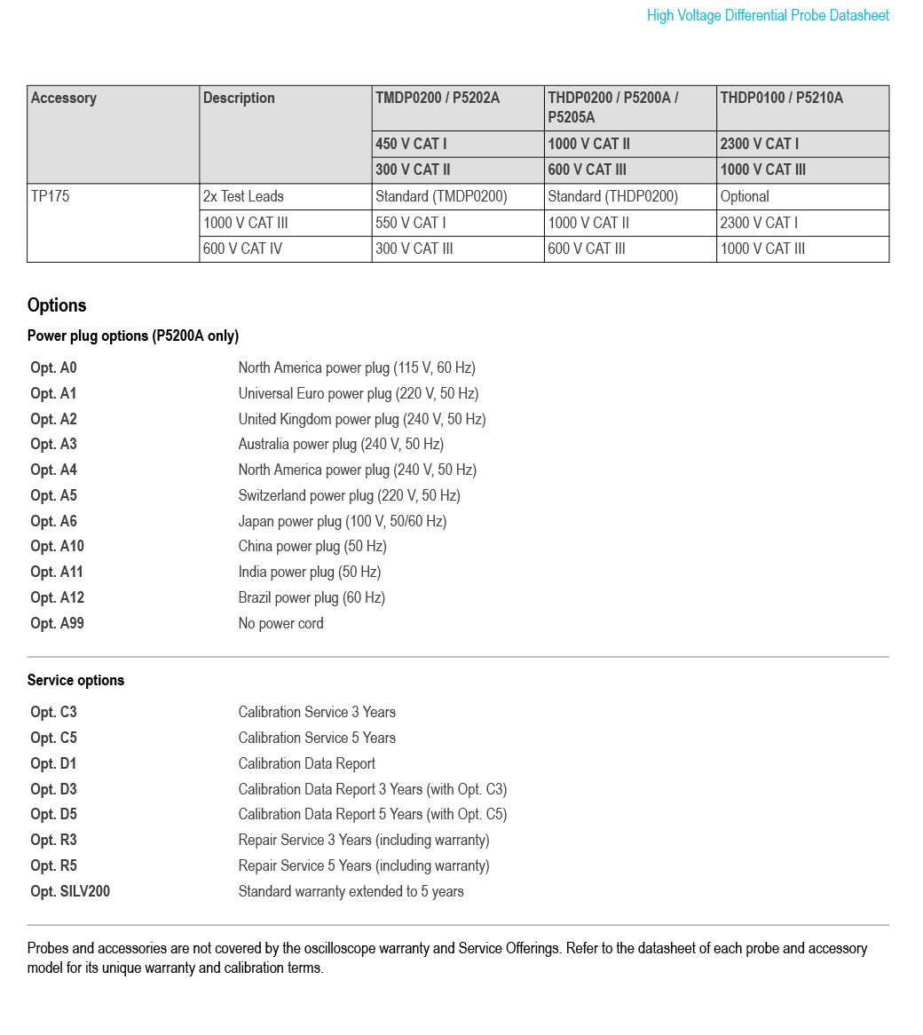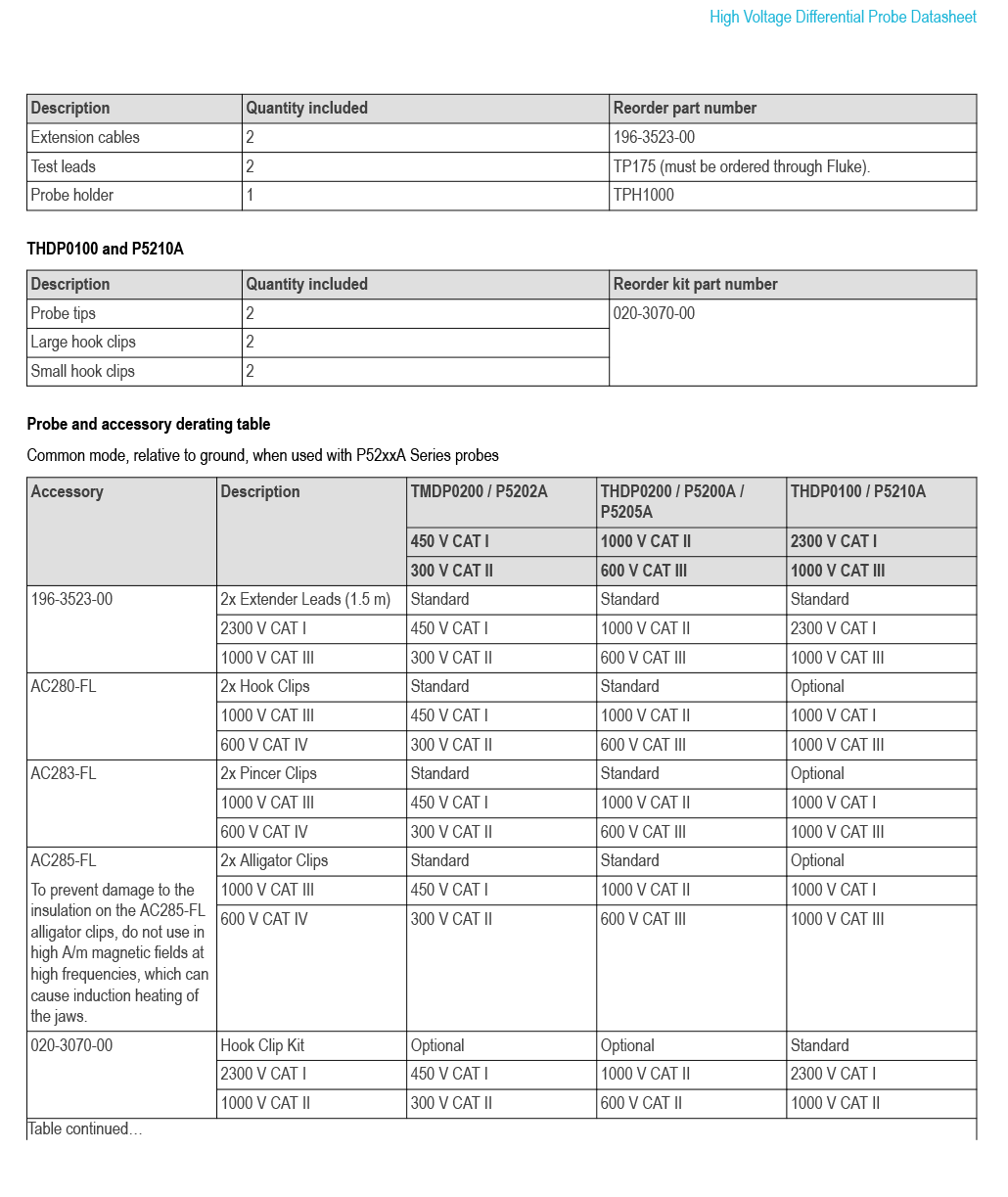 THDP0100 和 P5210A 具有泰克的差分动态范围功能,允许用户安全测量高达 ±6000 V。THDP0100 支持高达 100 MHz 的带宽和高达 2500 V/ns(1/1000 增益)的压摆率。这些探头配有两种尺寸的钩尖,并具有超量程视觉和听觉指示器,当超出探头的线性范围时会向用户发出警告。