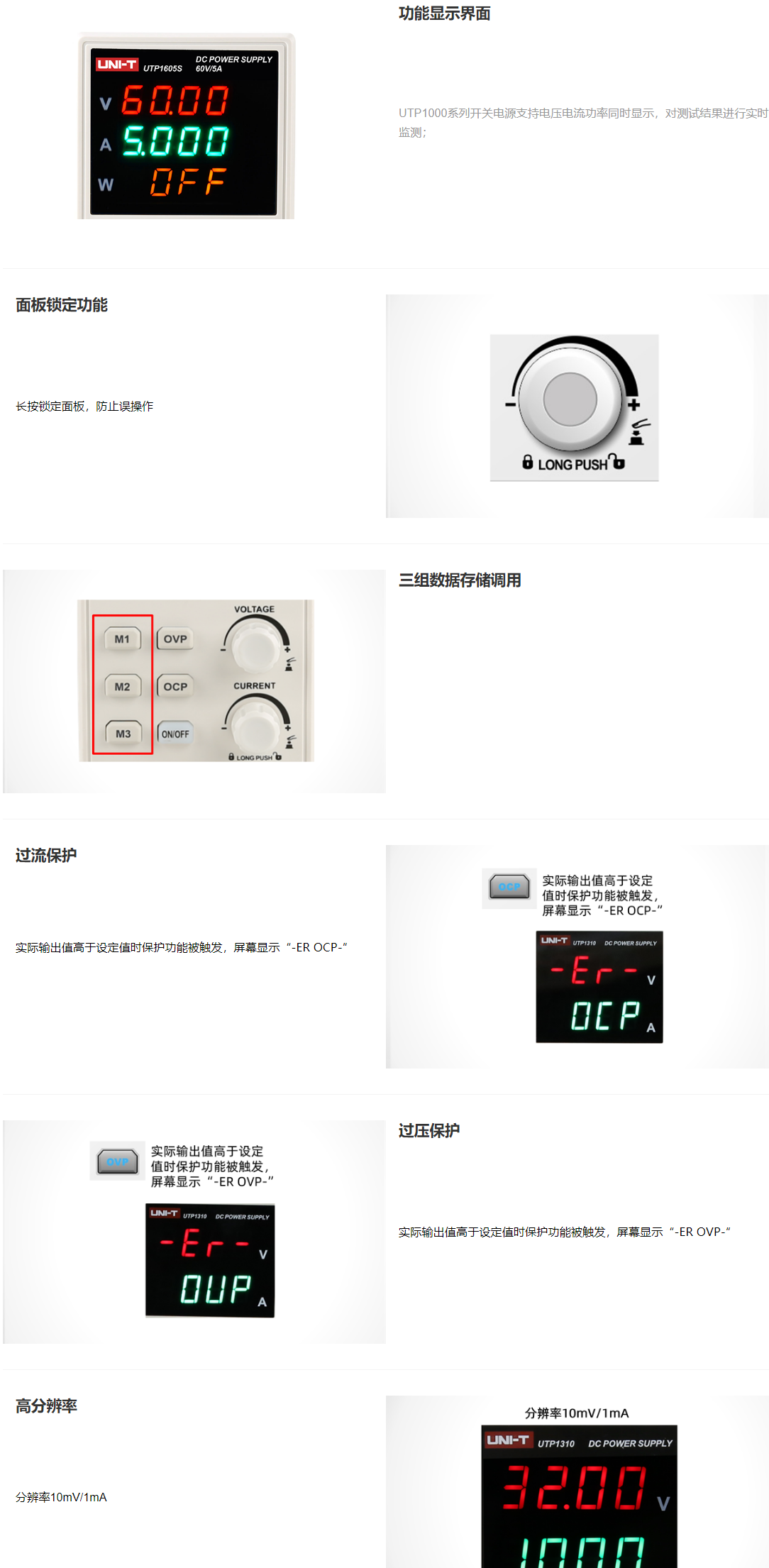 UTP1000系列经济型开关直流电源,拥有四位电压、电流、功率数码屏显示,测量范围广泛,具备10mV/1mA高精度分辨率,同时具备多种保护功能,可稳定可靠的运行,具有高性价比优势,是广泛应用于家电维修及电子产品DIY等场景的理想选择。