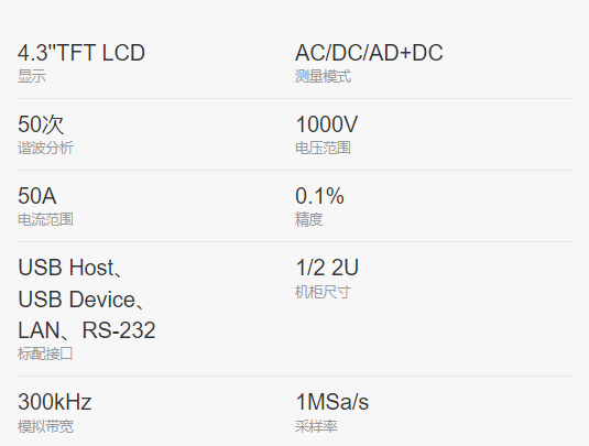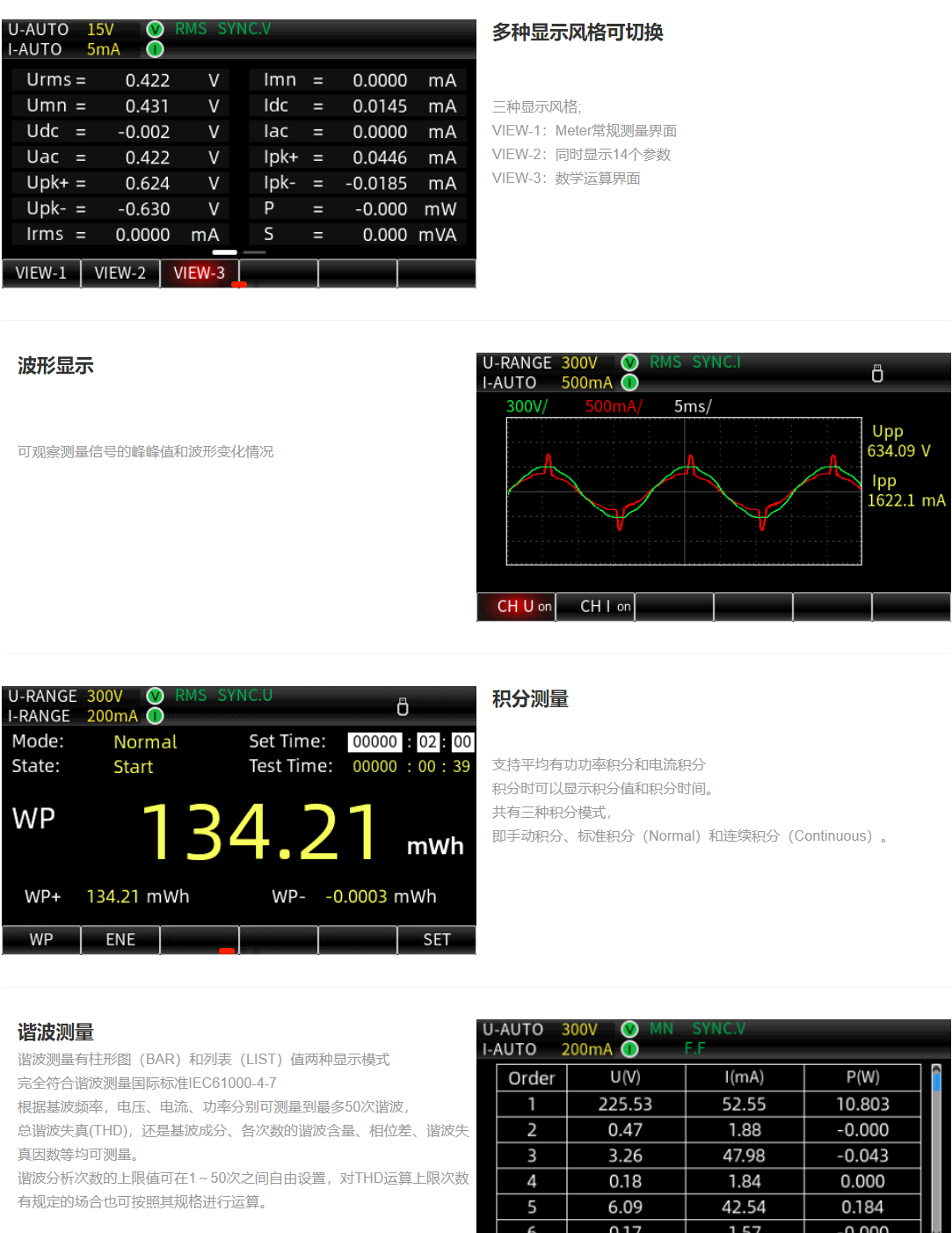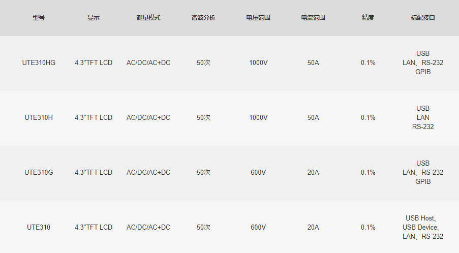 UTE300系列数字功率计,集电压、电流、功率、功率因数、频率等诸多功能为一体。UTE300具有 0.1%的功率测量精度,1MSa/s的采样率,100ms最快数据更新速度,电流测量范围 50μA~50A 可满足用户从小电流大电流的测量需求;同时具备 USB、RS-232、LAN、GPIB(选配)等接口满足用户不同的测试通信需求。