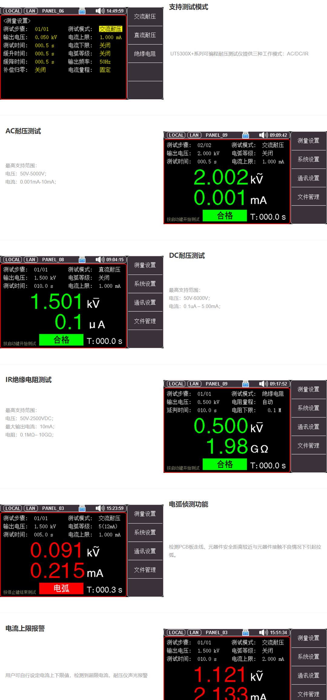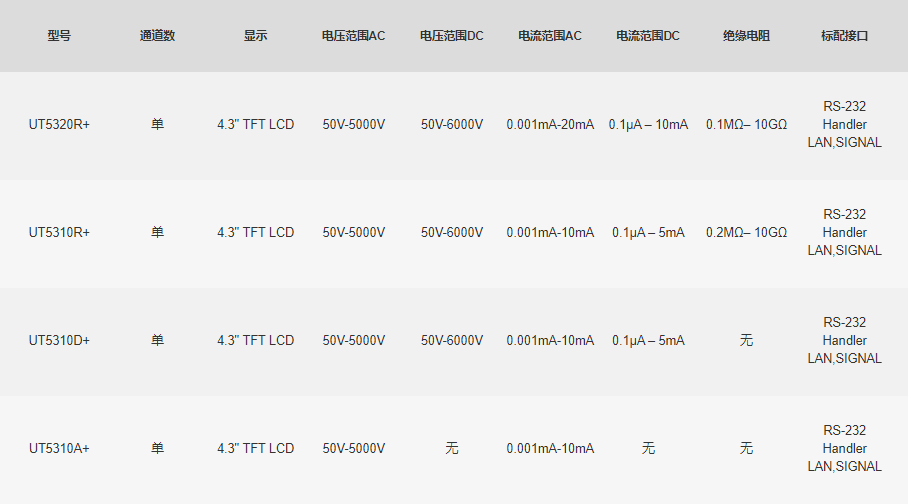 UT5300X+系列采用4.3英寸真彩液晶显示,通过各种实体按键以及数字键盘可以快速完成各种测试条件设置。机身使用高性能32位ARM微处理器控制,能够实时测量被测体的各项安规参数,整机线路模块间采用全隔离措施,抗干扰能力强,是集电气强度(交/直流耐压)、绝缘电阻多项测试功能于一体的仪器。