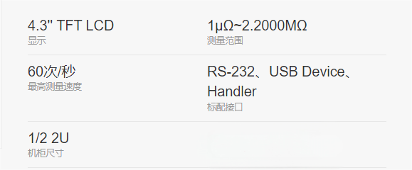 UT3510系列直流电阻测试仪包含UT3513和UT3516两个型号, 其测量电阻范围分别为20kΩ和2MΩ。仪器 4.3英寸大屏幕LCD显示,具备高精度、高分辨率及高速测量特性,拥有0.05%的最高准确度、1uΩ的最小分辨率和60次/秒的最高测量速度。同时标配USB Device、RS-232和Handler通讯接口,支持SCPI和Modbus RTU协议,可与计算机、PLC或WINCE设备进行通讯,高效完成远程控制和数据采集功能。