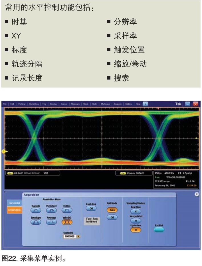 泰克数字示波器拥有设置功能,允许控制采集系统怎样处理信号。在阅读本说明时,看一下数字示波器上的采集选项。图22显示了采集菜单实例。
