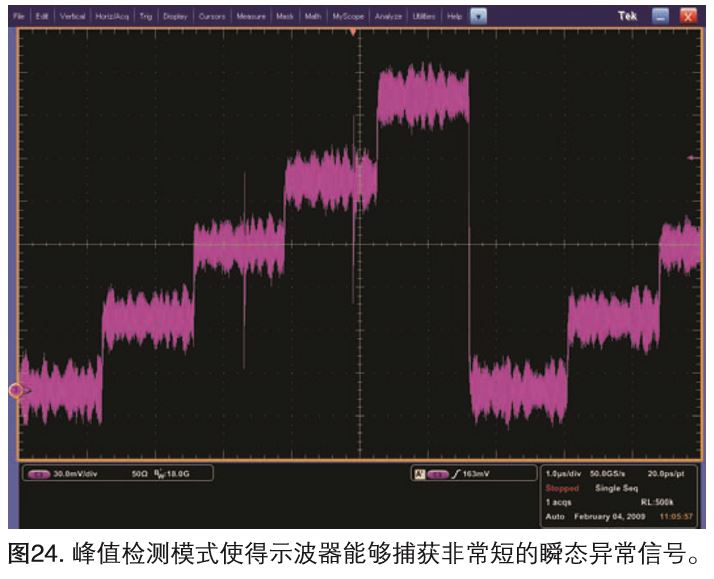 ■峰值检测模式:示波器保存两个波形间隔期间获得的最小值样点和最大值样点,使用这些样点作为两个对应的波形点。即使在时基设置非常低(低速时基设置意味着长波形间隔)时,峰值检测模式的数字示波器仍很快的采样率运行ADC,能够捕获采样模式下波形点之间发生的快速信号变化,如图23所示。峰值检测模式特别适合观察时间上相距很远的窄脉冲,如图24所示。
