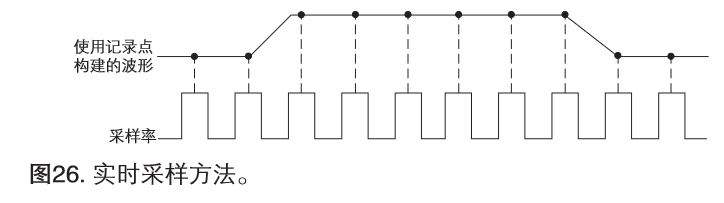 实时采样特别适合频率范围不到示波器最大采样率一半的信号。这里,示波器可以在波形一次“扫描”中采集超过足够量的点,构建准确的画面,如图26所示。实时采样是使用泰克示波器捕获快速、单次、瞬态信号的唯一方式。