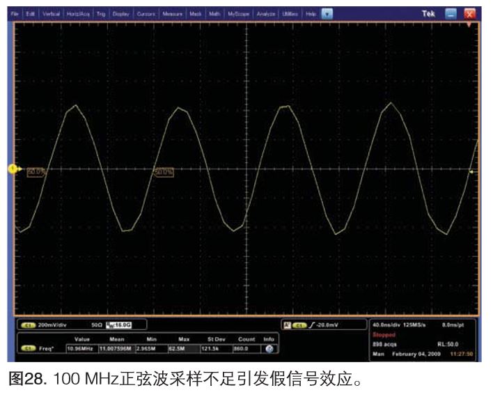 这些事件只发生一次,必须在发生的同一时段采样。如果采样率没有足够快,高频成分会“向下折叠到”较低频率中,在显示画面中引起假信号,如图28所示。此外,在数字化后,存储波形要求的高速存储器进一步提高了实时采样的复杂稈度。如需与准确检定高频成分所需采样率和记录长度有关的进一步细节,请参阅“性能术语和考虑因素”中的“采样率和记录长度”部分。