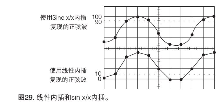 支持实时采样和内插技术的泰克数字示波器获得可以显示的离散的信号样点。但是,很难观察用点表示的信号,特别是可能只有几个点表示信号的高频部分。为协助观察信号数字示波器一般提供内插显示模式。简而言之,内插“把多个点连接起来”,因此能够准确显示每个周期只采样几次的信号。通过使用实时采样及内插技术,示波器在实时模式下把一遍中信号的多个样点连接起来,使用内插填充空白。线性内插是基于少量点估计波形形状的一种处理技线性内插使用直线连接样点。这种方法限于重建直边信号,如图29所示,其更适宜于方波。sinx内插用途更加广泛,用曲线连接样点,如图29所示。sinxⅸ内插是一种数学运算过程,在这个过程中,其计算样点,填充实际样点之间的时间。这种内插形式更适宜于曲线的、不规则的信号形状,这些信号形状在实际世界中要远比纯粹的方波和脉冲常见得多。因此,在采样率是系统带宽3-5倍的应用中,首选方法是snx内插。