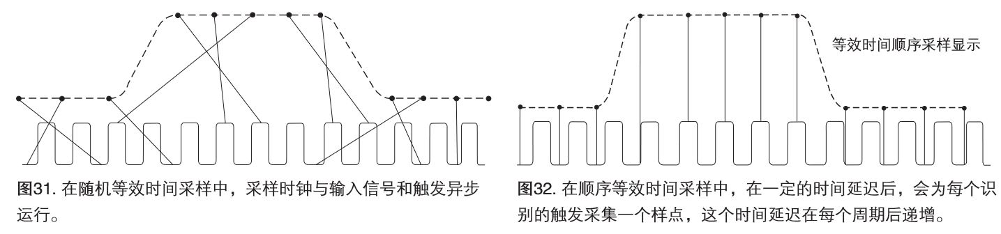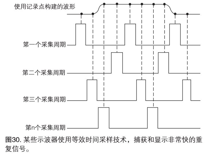 在测量高频信号时,泰克示波器可能会在一次扫描中收集足够的样点。可以使用等效时间采样,准确地采集频率超过泰克示波器频率一半的信号,如图30所示。
