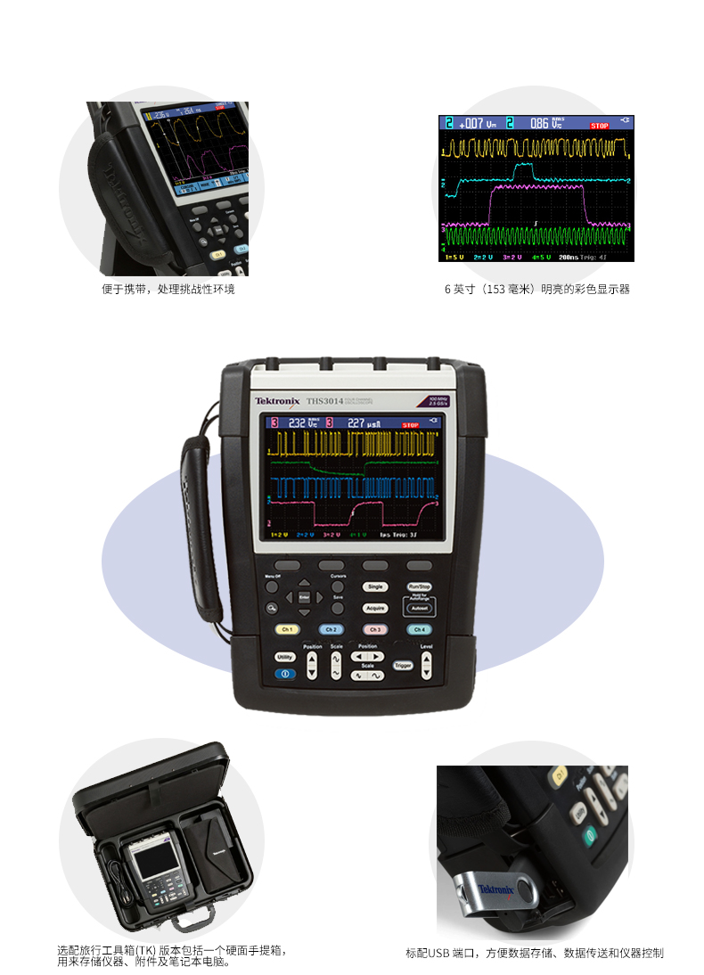 重量很轻的 THS3000 手持式示波器系列具有四个隔离通道和最长 7 小时电池寿命,可让您在工作台或者现场安全地进行浮动和差分测量。
