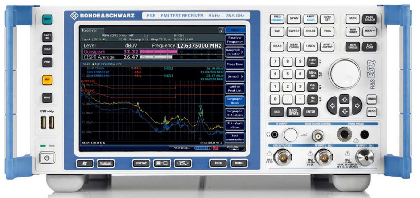 R&S®ESR完全符合CISPR16-1-1标准,可测量频率从10Hz到26 GHz的传导和辐射干扰。借助基于FFT的时域扫描技术,该仪器能以极高速度测量电磁干扰。与此同时,R&S®ESR可作为功能强大的实验室用信号和频谱 分析仪。由于具有众多诊断工具的实时频谱分析能力,该接 收机也能详细分析干扰信号及其历史特性。另外,清晰的结构及直观的触摸界面使R&S®ESR非常易于操作。