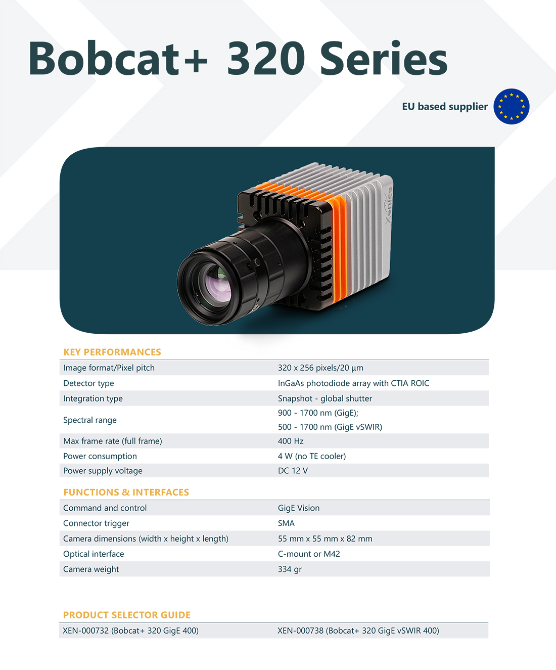 BOBCAT+ 320系列支持GigE传输接口,高帧频可达400Hz。这款改良的BOBCAT 320+具有两种增益模式:高增益模式和高动态范围模式,具有两种读出方式:边积分边读出模式(IWR)或者先积分再读出模式(ITR)。另外,还有vSWIR 版本供您选择。
