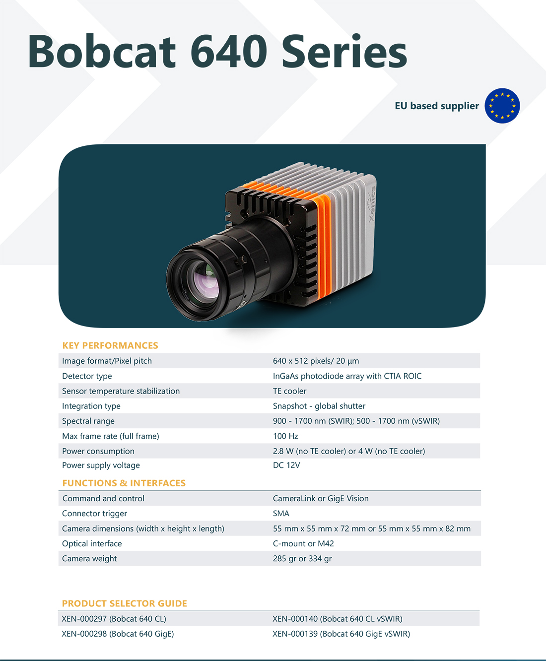 Bobcat 640 相机快帧频可达100Hz。 有Cameralink 和 GigE 两种接口可供选择,同时也具有重量轻,能耗低的优势。