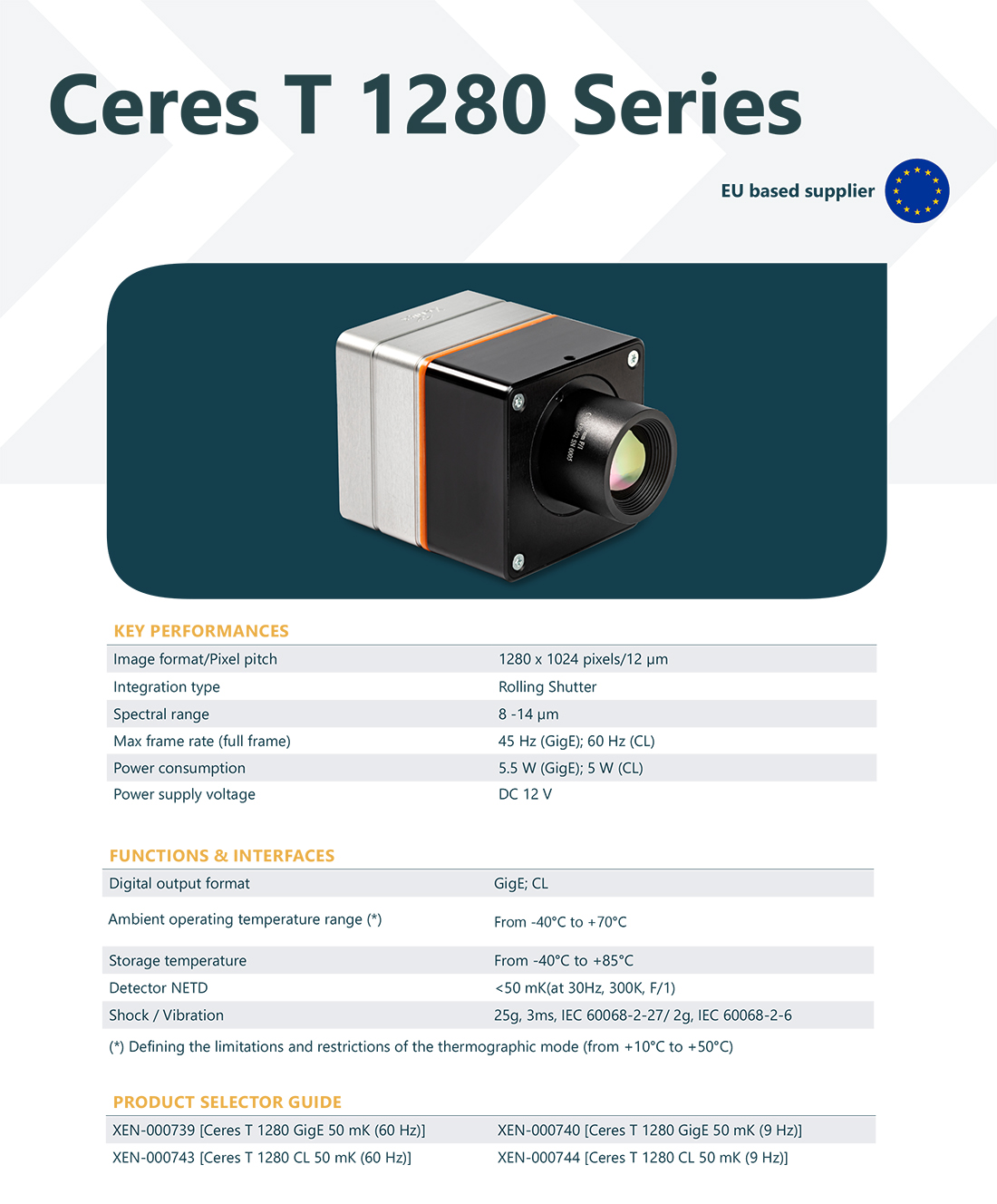 Ceres T 1280 系列是基于Dione 1280 热成像机芯开发而成,分辨率为1280*1024,像元尺寸为12um,NETD小于50mK。这款相机提供稳定以及精确的在线测温功能,测温量程最高可达400 °C。