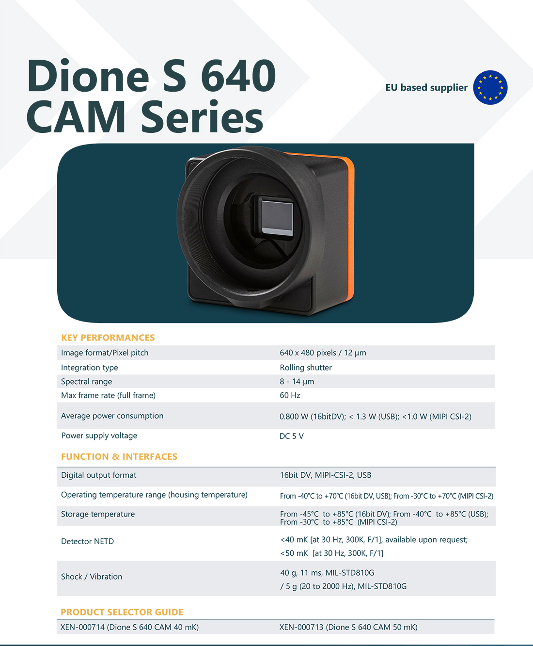 Dione S 640 CAM 系列基于非制冷 12 μm 间距微测辐射热计探测器,分辨率为 640 × 480,NETD 小于 40 mK(可根据要求提供)和 50 mK。