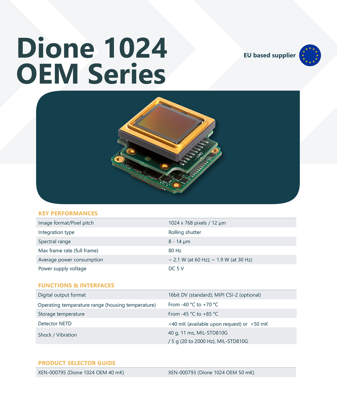 Dione 1024 OEM 系列基于优质的探测器,具有 1024x768 像素和 12 μm 像素间距。 NETD(噪声等效温差)小于 40 mK (可按要求提供) 或 50 mK,帧频为 80 Hz。