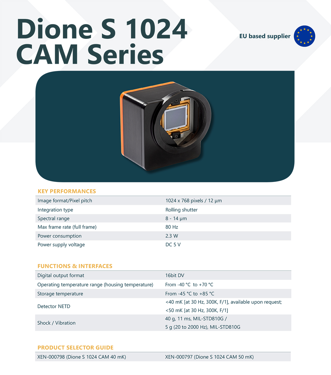 Dione S 1024 CAM 系列基于具有 1024x768 像素和 12μm 像素间距的 Dione 1024 OEM 热成像核心研发而成。NETD(噪声等效温差)小于40 mK (可按要求提供) 或 50 mK,******帧频为 80 Hz。