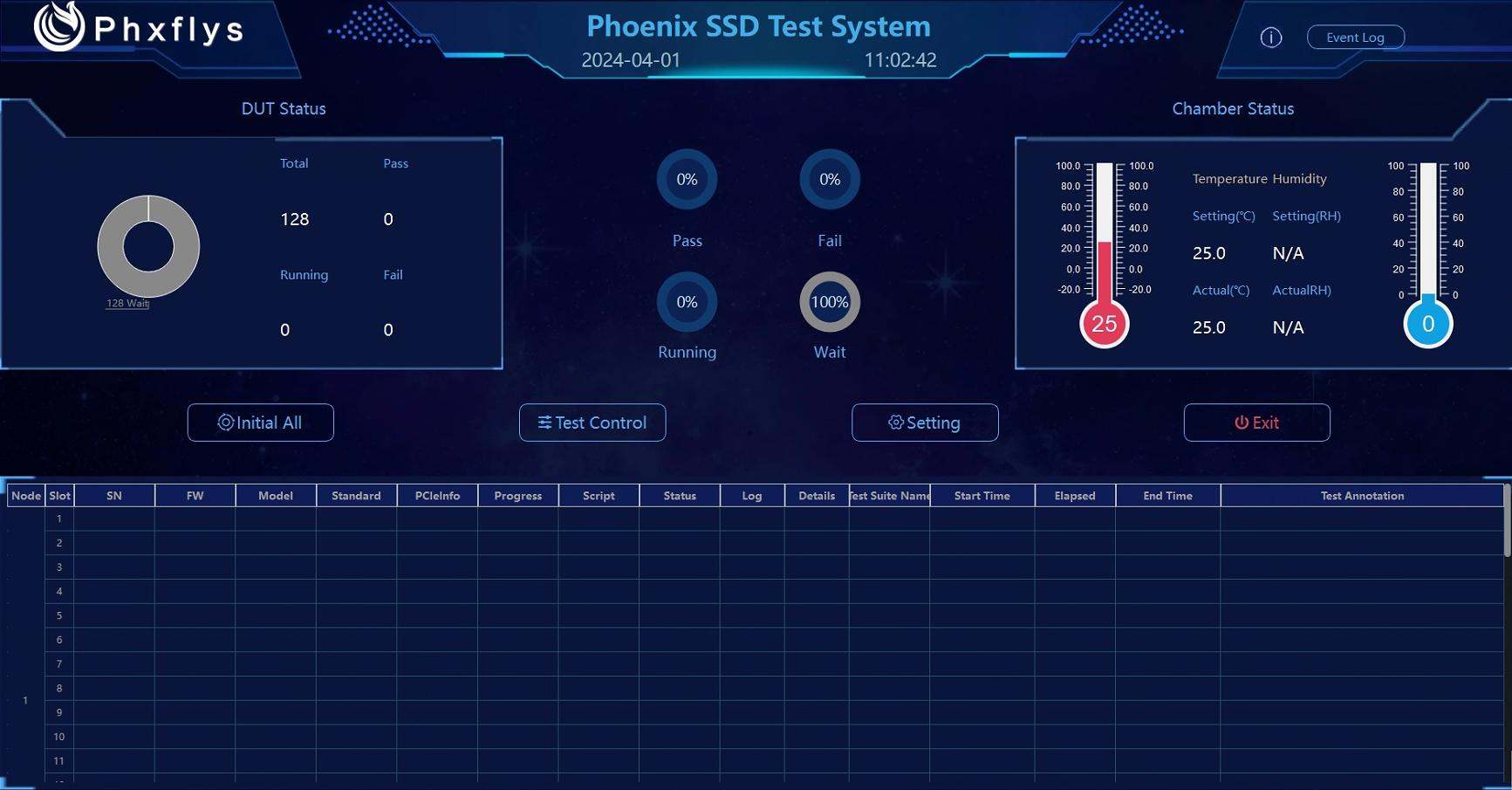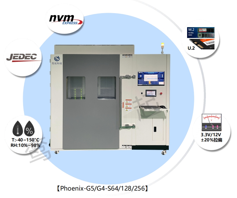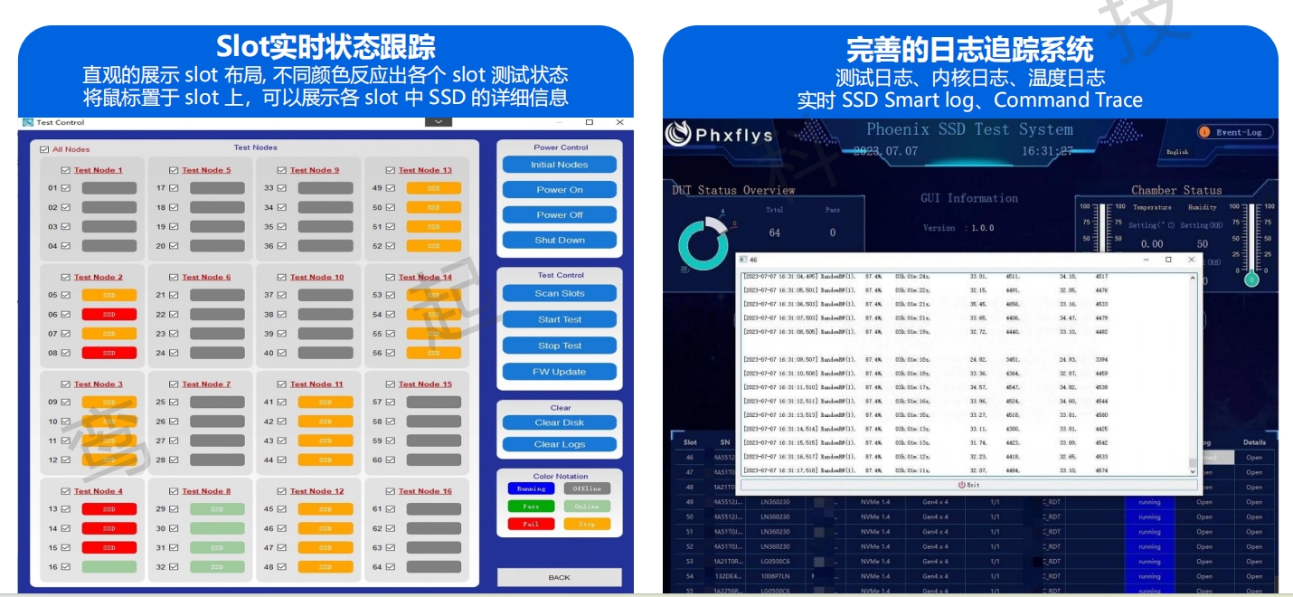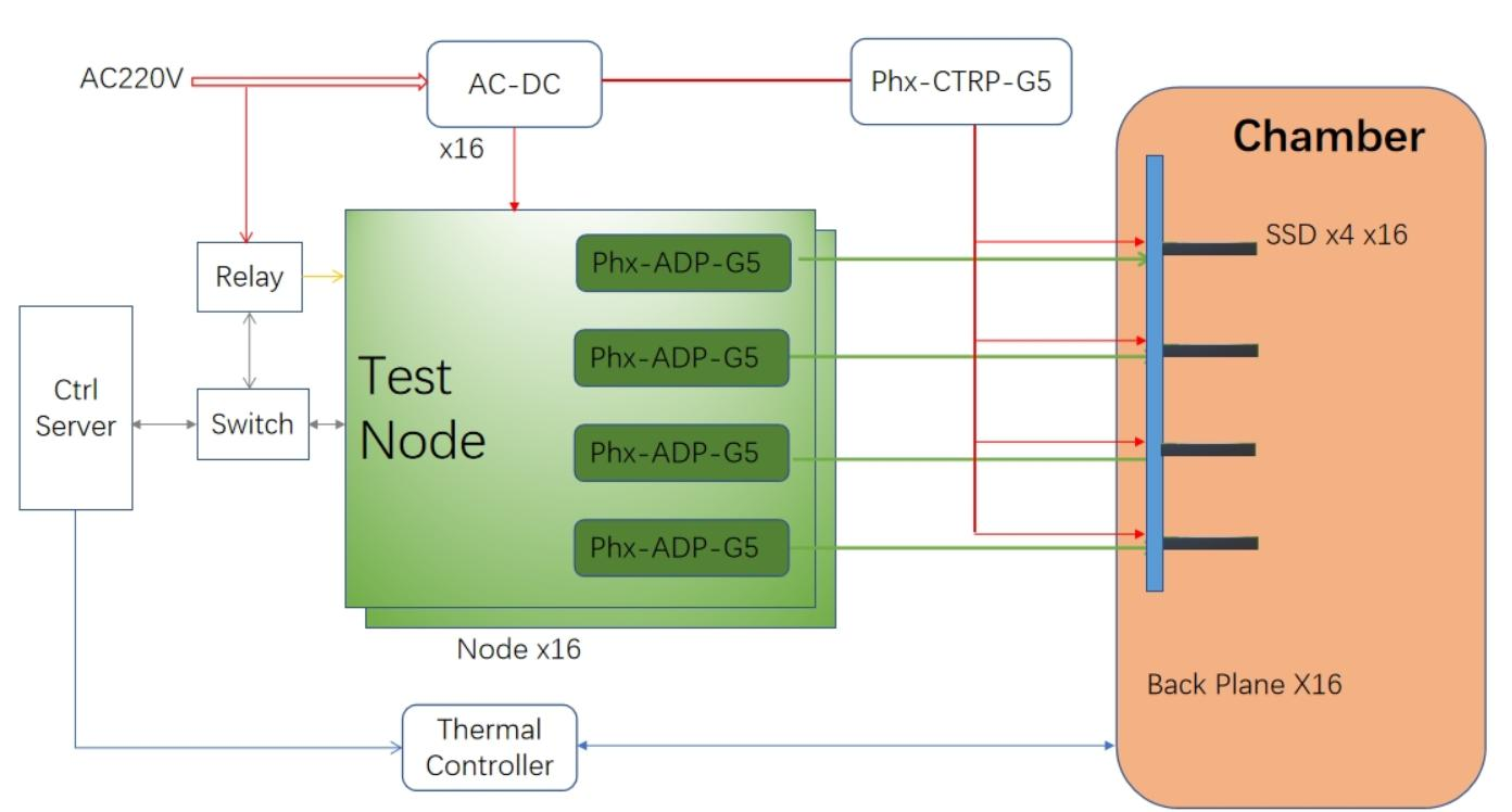 Phoenix由一台控制中心(Control Server)及若干测试节点(Test Node),辅助模块等组成可提供Gen5 SSD的满速并行测试