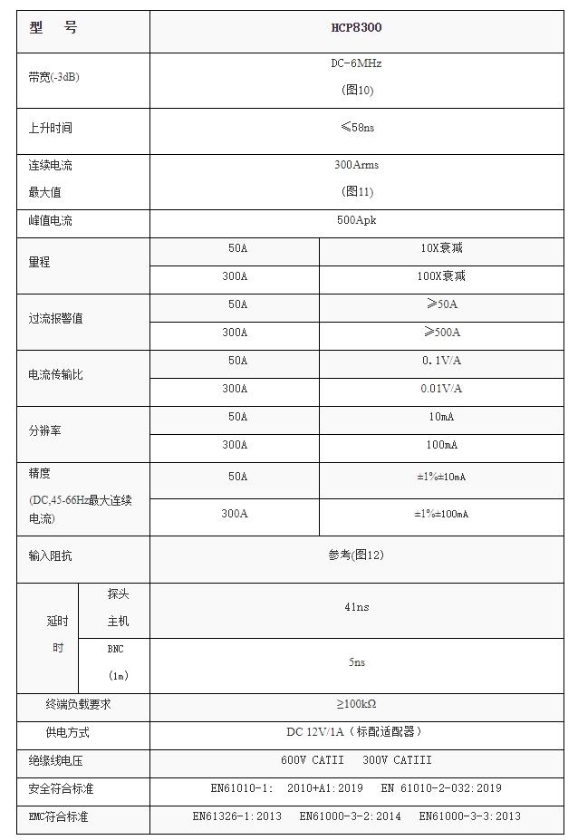 HCP8300钳口可夹住直径达20mm的导线,适用于大电流应用场合;测量300A的连续电流和500A的峰值电流,提供了6MHz的带宽;探头具有300A (100X)和50A (10X)两个量程可选择,10X量程用于小电流测量,分辨率高达10mA。HCP8000系列电流探头常用于开关电源、马达驱动器、电子镇流器、LED照明、新能源等设计和测试应用中。