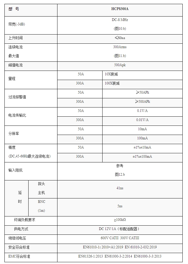 HCP8300钳口可夹住直径达20mm的导线,适用于大电流应用场合;测量300A的连续电流和500A的峰值电流,提供了6MHz的带宽;探头具有300A (100X)和50A (10X)两个量程可选择,10X量程用于小电流测量,分辨率高达10mA。HCP8000系列电流探头常用于开关电源、马达驱动器、电子镇流器、LED照明、新能源等设计和测试应用中。