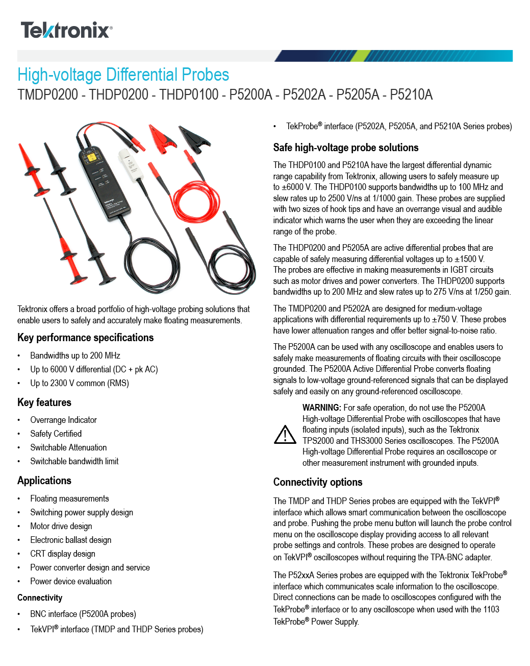 THDP0100 和 P5210A 具有泰克的差分动态范围功能,允许用户安全测量高达 ±6000 V。THDP0100 支持高达 100 MHz 的带宽和高达 2500 V/ns(1/1000 增益)的压摆率。这些探头配有两种尺寸的钩尖,并具有超量程视觉和听觉指示器,当超出探头的线性范围时会向用户发出警告。