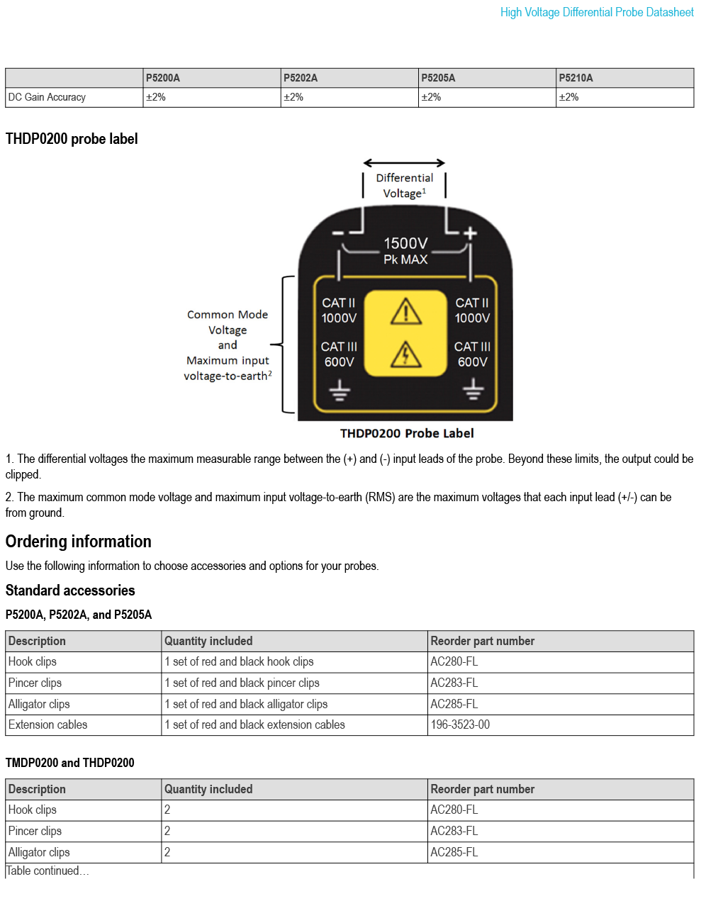 THDP0200 和 P5205A 是有源差分探头,能够安全测量高达 ±1500 V 的差分电压。这些探头可有效测量电机驱动器和电源转换器等 IGBT 电路。 THDP0200 支持高达 200 MHz 的带宽和高达 275 V/ns(1/250 增益)的转换速率。