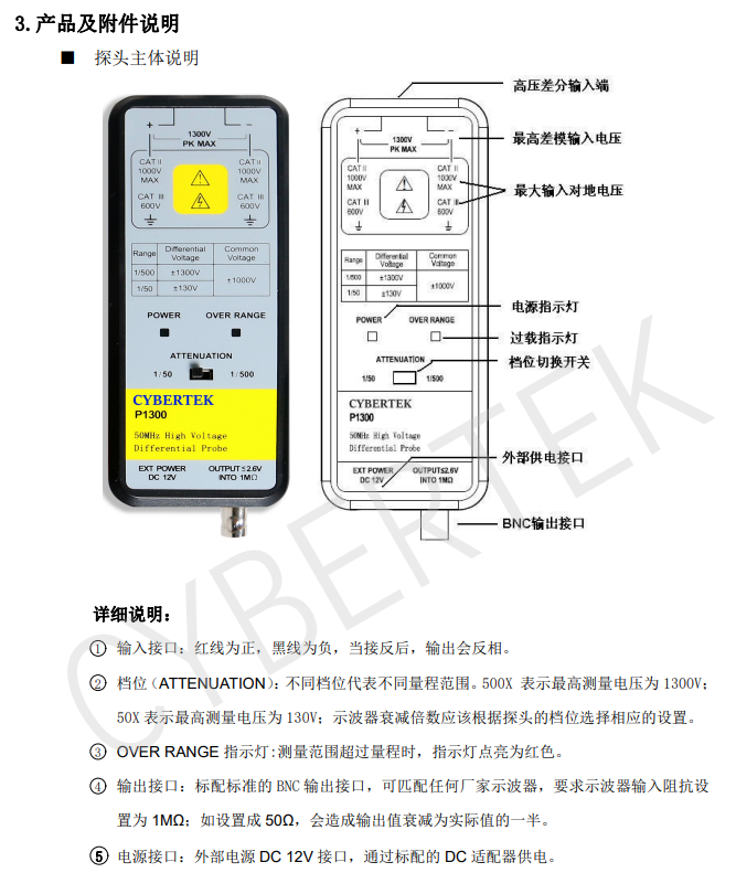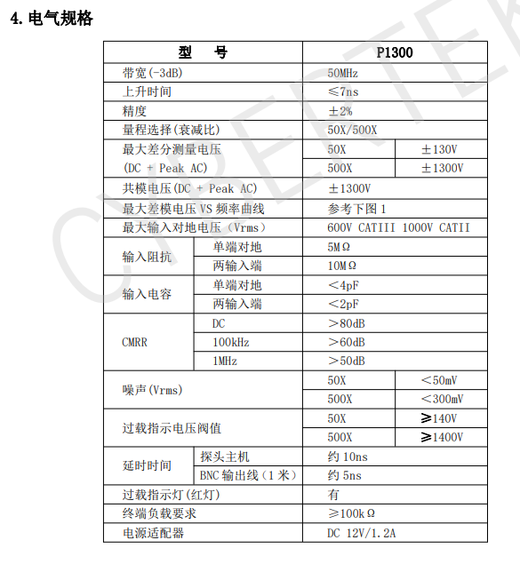 P1300高压差分探头是具有浮地测量功能的高压差分探头。其带宽达到50MHz,满足了大部分测试系统的需要;双量程可供选择,其差动测量电压范围满足大部分测试电路的要求;具有过载报警功能;探头配备标准的BNC输出接口,可与任何厂家的示波器配合使用。探头具备良好的共模噪声抑制能力,输入端具有较高的输入阻抗和较低电容,可以准确高速地测量差分电压信号。可广泛用于开关电源﹑变频器﹑电子镇流器﹑变频家电和其它电气功率装置等的研发﹑调试或检修工作中。