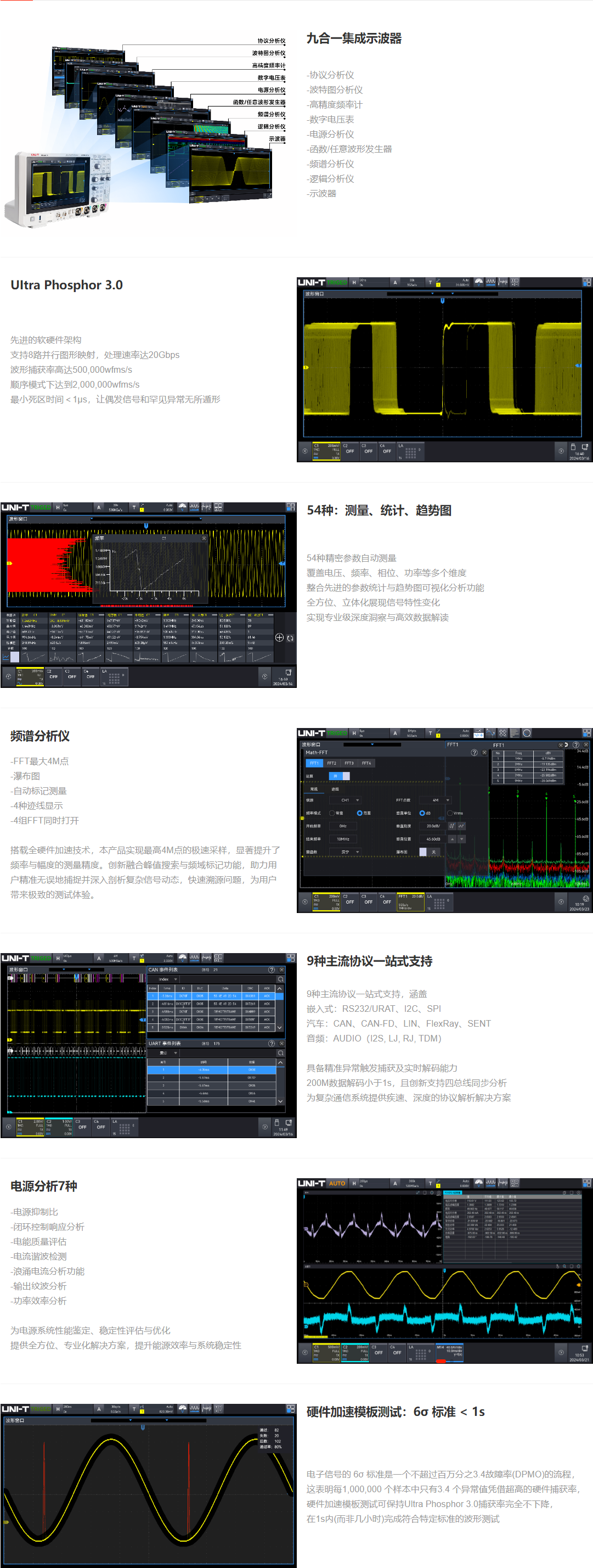MSO2000X系列混合信号示波器,采样率最高5GSa/s,每通道存储深度可达100Mpts。采用独有的 Ultra Phospho® 3.0技术,波形捕获率高达2,000,000 wfms/s,具有 256 级辉度等级色温显示,先进的数字触发系统,触发灵敏度高,触发精度达到10ps;支持多种高级触发、串行总线触发和解码;支持频谱分析、电源分析、直方图、波形录制、增强分辨率、通过测试、搜索和导航等高级功能和分析模式;具备丰富的测量和数学运算功能。采用了 10.1 英寸电容式触摸屏,支持多种手势实现对波形的常用操作,以及WebServer实现远程操控一款功能全、性能强大的仪器设备。