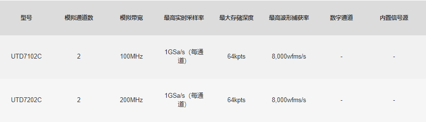 UTD7000C系列配置100MHz级别带宽,实时采样率为1GS/s,提供双通道等性能输出,存储深度64kpts。是一款针对广泛的数字示波器市场包括通信,半导体,计算机,仪器仪表,工业电子,消费电子,汽车电子,现场维修,研发/教育等众多领域的通用设计/调试/测试的需求而设计的示波器。