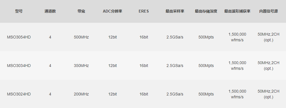MSO3000HD是一款集成了4信号通道,16通道逻辑分析仪和2通道任意波形发生器的高分辨示波器。配备了R12™12bit分辨率的ADC,可通过ERES增强分辨率至16bit,其采样率最高可达2.5GSa/s,存储深度为500Mpts,波形捕获率为1,500,000wfms/s,依此可确保高质量的波形分析。MSO3000HD支持11种触发事件,12种协议数据,还可通过WebServer实现远程操控,适用于医疗、低功耗设备、集成电路、高精度电源、电力、汽车电子等领域的各种测试和分析任务,是一款功能全、性能强大的仪器设备。