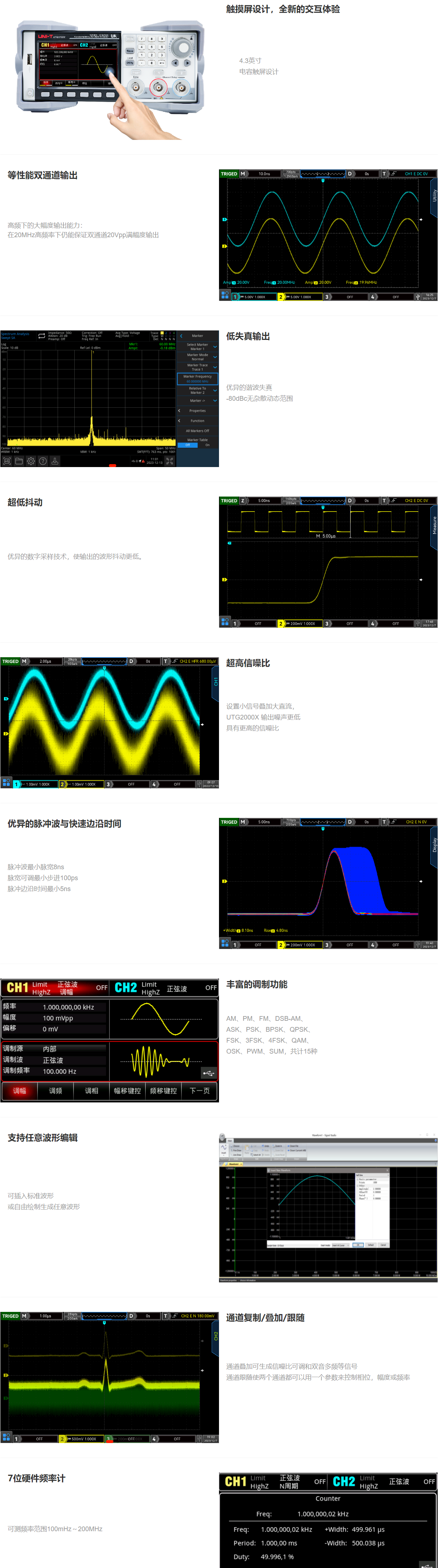 UTG2000X系列使用直接数字合成技术以产生精确、稳定的波形输出,低至1μHz的频率分辨率,是一款经济型、高性能、多功能的函数/任意波形发生器。可生成精确、稳定、纯净、低失真的输出信号,操作便捷、优越的技术指标及人性化的图形显示,是满足学习、测试需求、提高工作效率的多用途设备。