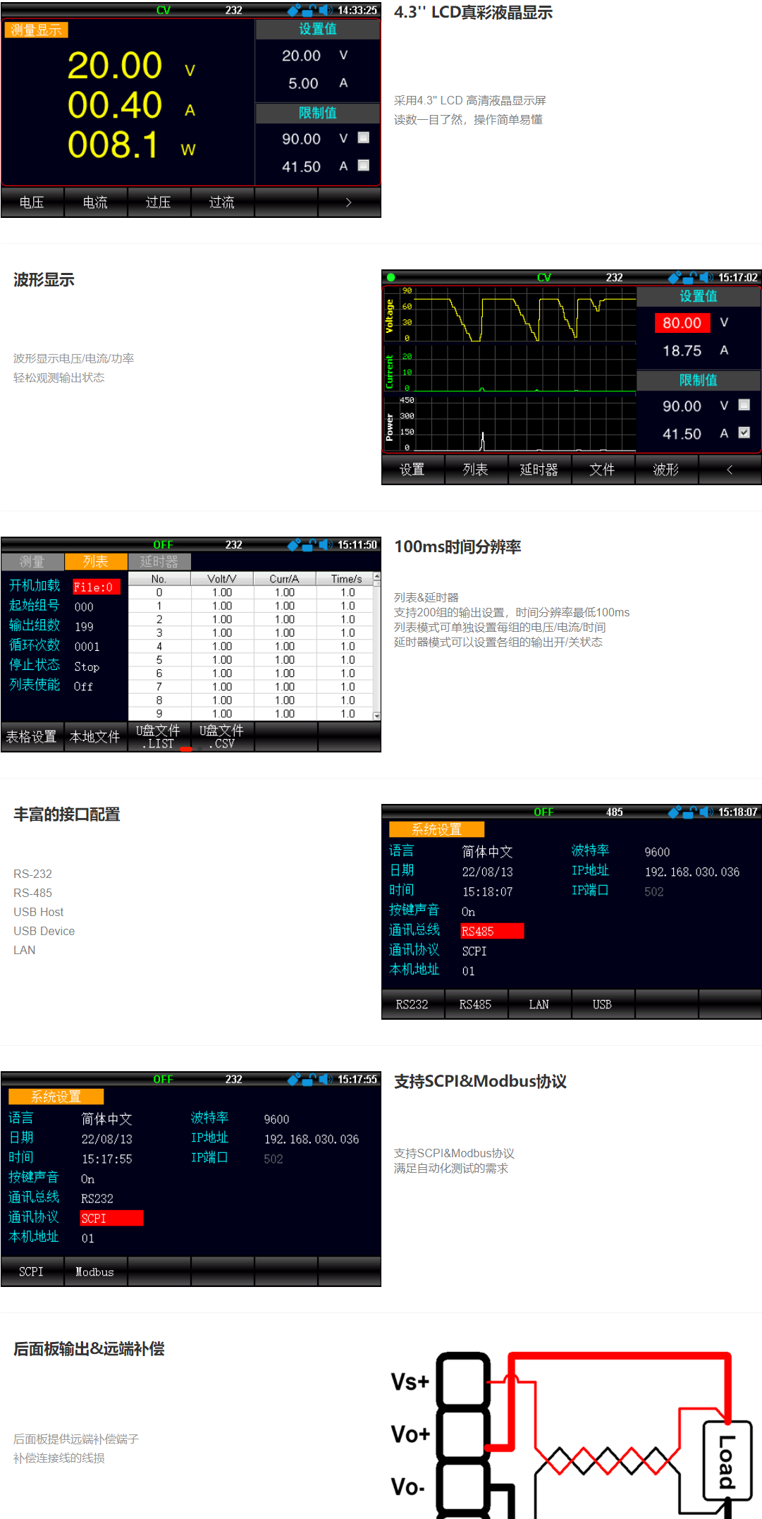 UDP6723/6724是一款大功率的宽范围可编程直流开关电源,输出功率最高可达1500W,拥有卓越的负载调节率和电源调节率,内置自动列表功能,电压电流可波形显示,操作更简便,显示更直观,满足大多数实验室、研发及自动化测试等应用场所。
