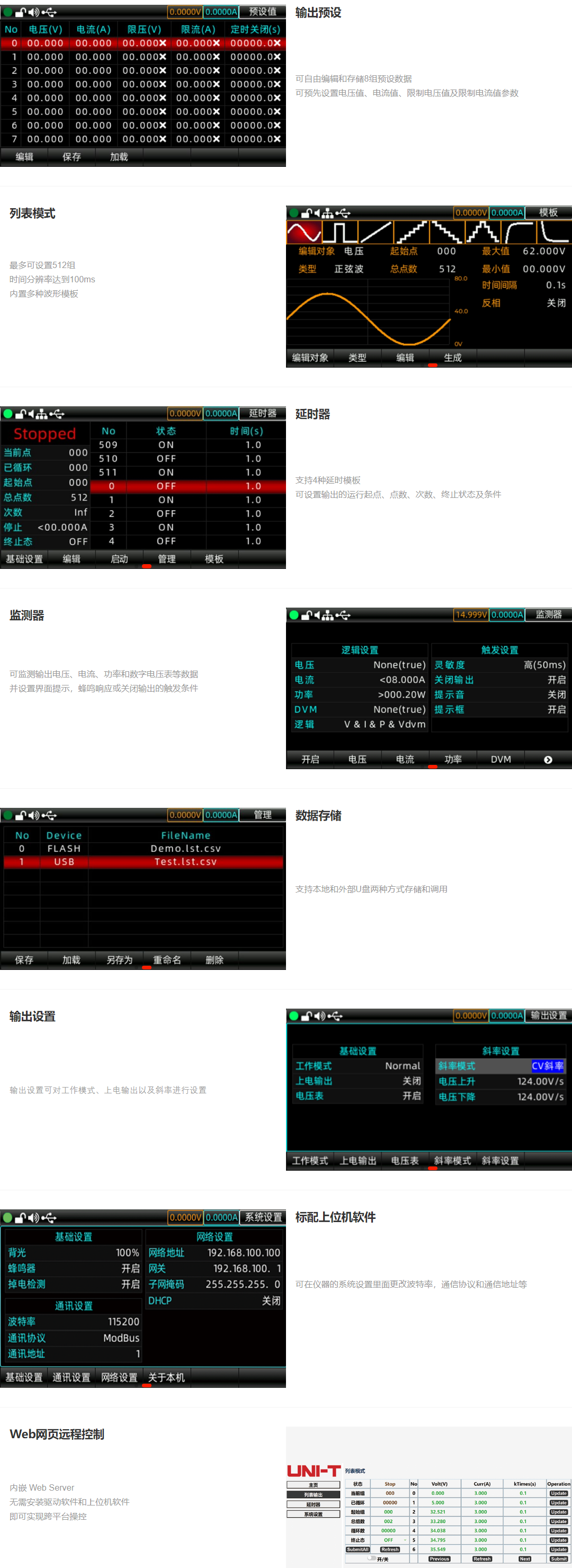 UDP6900系列宽范围可编程开关直流电源,在固定的功率下实现多种电压和电流的组合输出,全系列内置标准RS-232、RS-485、USB和模拟量接口,支持SCPI协议,方便远程控制、工业PLC控制和组建智能化测试平台,广泛应用于电源模块、电池充电及传感器等多种测试领域。