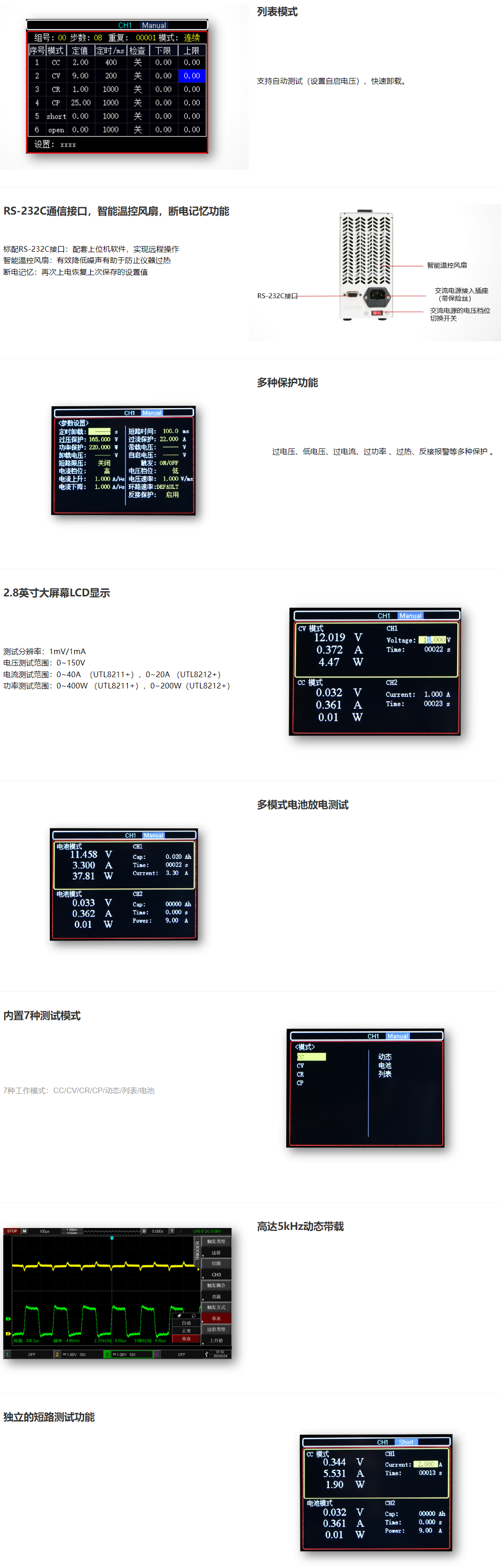 UTL8200+系列电子负载配有2.8英寸液晶显示屏,操作方便简洁,外观时尚大方,运行稳定,支持双通道完全独立测试,拥有较宽的功率测量范围,测试分辨率最高可达1mV/1mA,具备丰富的测试功能与模式,同时标配 RS-232C 通信接口,灵活满足各种现场测试条件,实现与自动化生产线、自动测试系统(ATS)无缝连接。