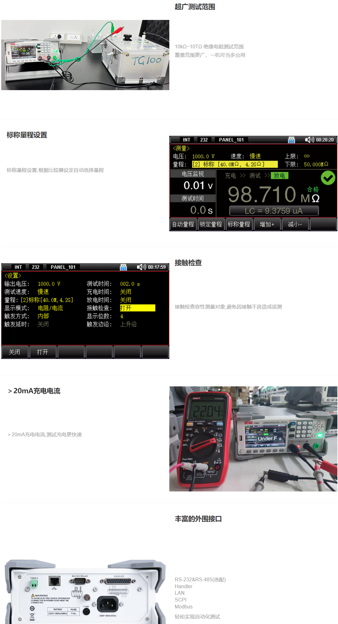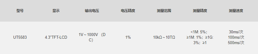 UT5583绝缘电阻测试仪采用高性能处理器控制,4.3寸 TFT-LCD显示。输出电压可任意设置1V~1000V,满足大部分测试需求。六量程测试,绝缘电阻测量范围可达10kΩ~10TΩ,高达30ms/次的采样速率,丰富的通讯接口,为自动化生产提供了优选测试解决方案。