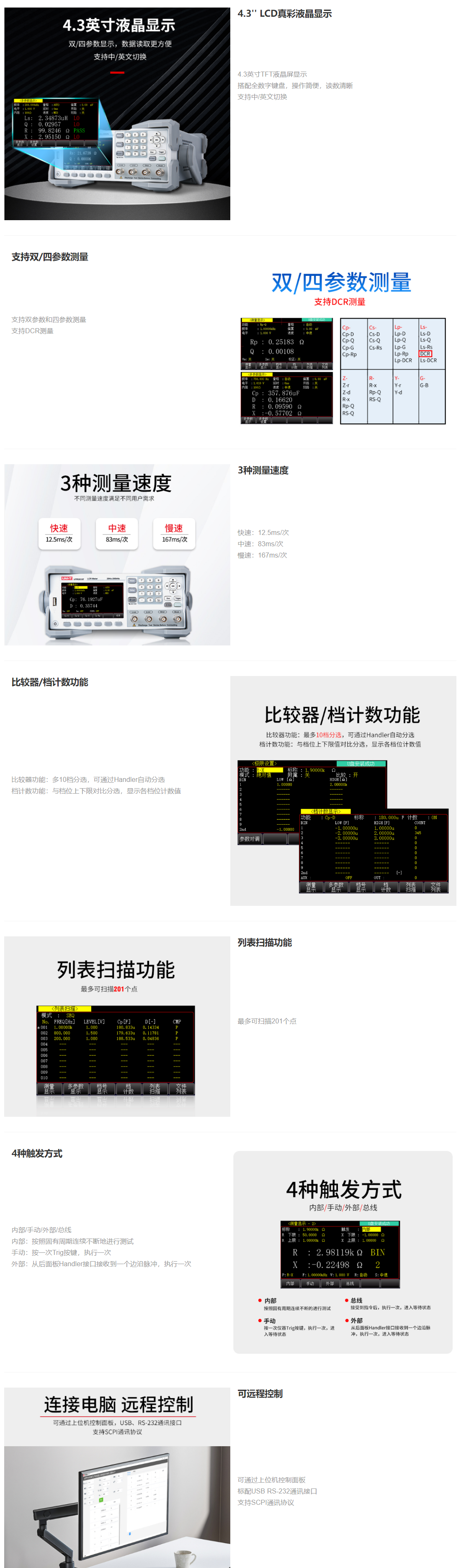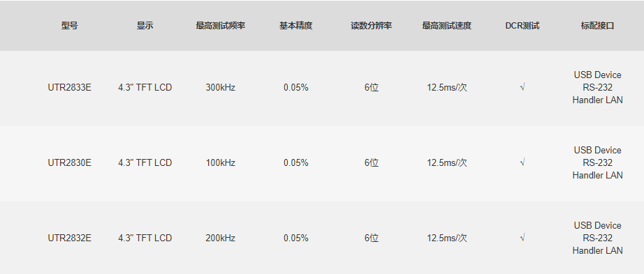 UTR2830E系列LCR数字电桥采用4.3英寸 TFT-LCD显示屏,最高可支持四参数同时显示,测试频率20Hz~300kHz,全数字键盘,搭配实时操作系统,操作更简便,0.05%的基本精度,比较器支持10档分选,测试更可靠。可满足生产线质量保证、进货检验及自动化生产,实验室测试的需求。