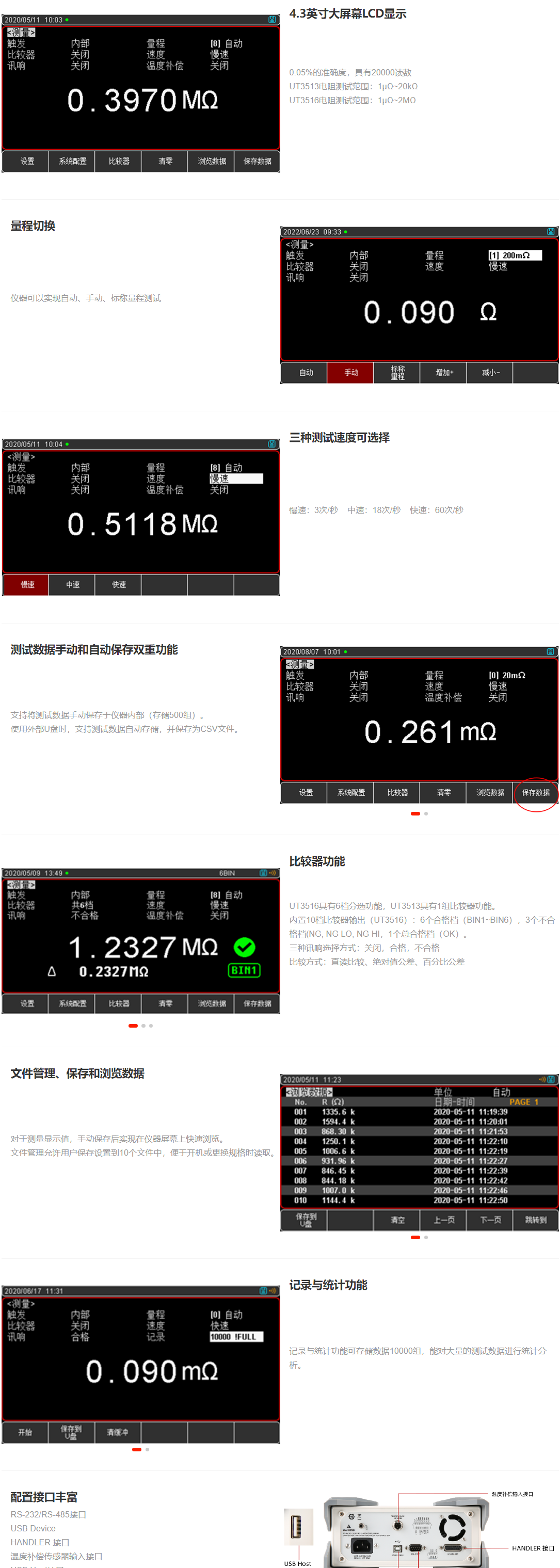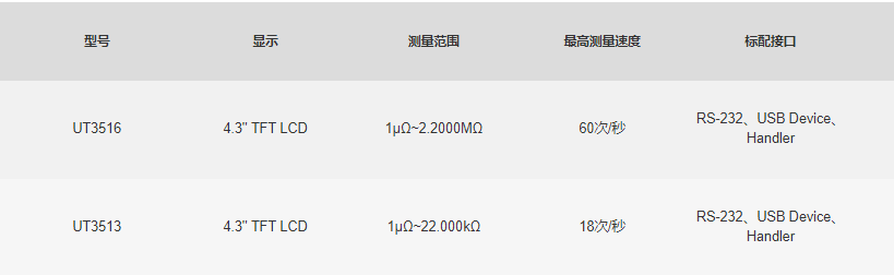 UT3510系列直流电阻测试仪包含UT3513和UT3516两个型号, 其测量电阻范围分别为20kΩ和2MΩ。仪器 4.3英寸大屏幕LCD显示,具备高精度、高分辨率及高速测量特性,拥有0.05%的最高准确度、1uΩ的最小分辨率和60次/秒的最高测量速度。同时标配USB Device、RS-232和Handler通讯接口,支持SCPI和Modbus RTU协议,可与计算机、PLC或WINCE设备进行通讯,高效完成远程控制和数据采集功能。