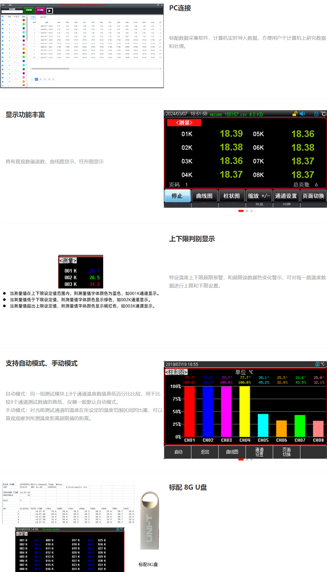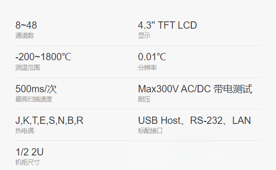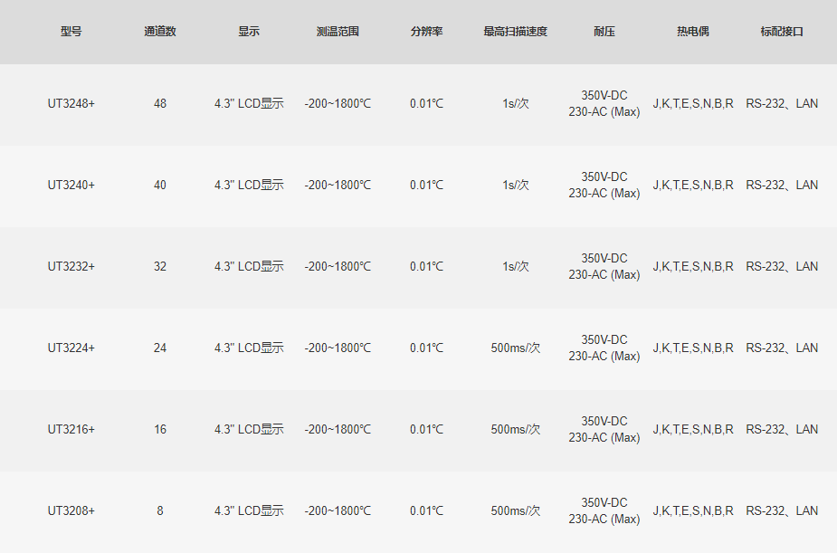 UT3200+系列多路温度测试仪,共有6款型号UT3208+/UT3216+/UT3224+/UT3232+/UT3240+/UT3248+,分别对应8、16、24、32、40、48通道,仪器4.3英寸液晶彩屏显示,界面美观,可同时对多路温度数据进行采集,上超下超报警和通讯传输,兼容多种温度传感器,响应速度快,数据稳定,同时具备断偶检测功能。