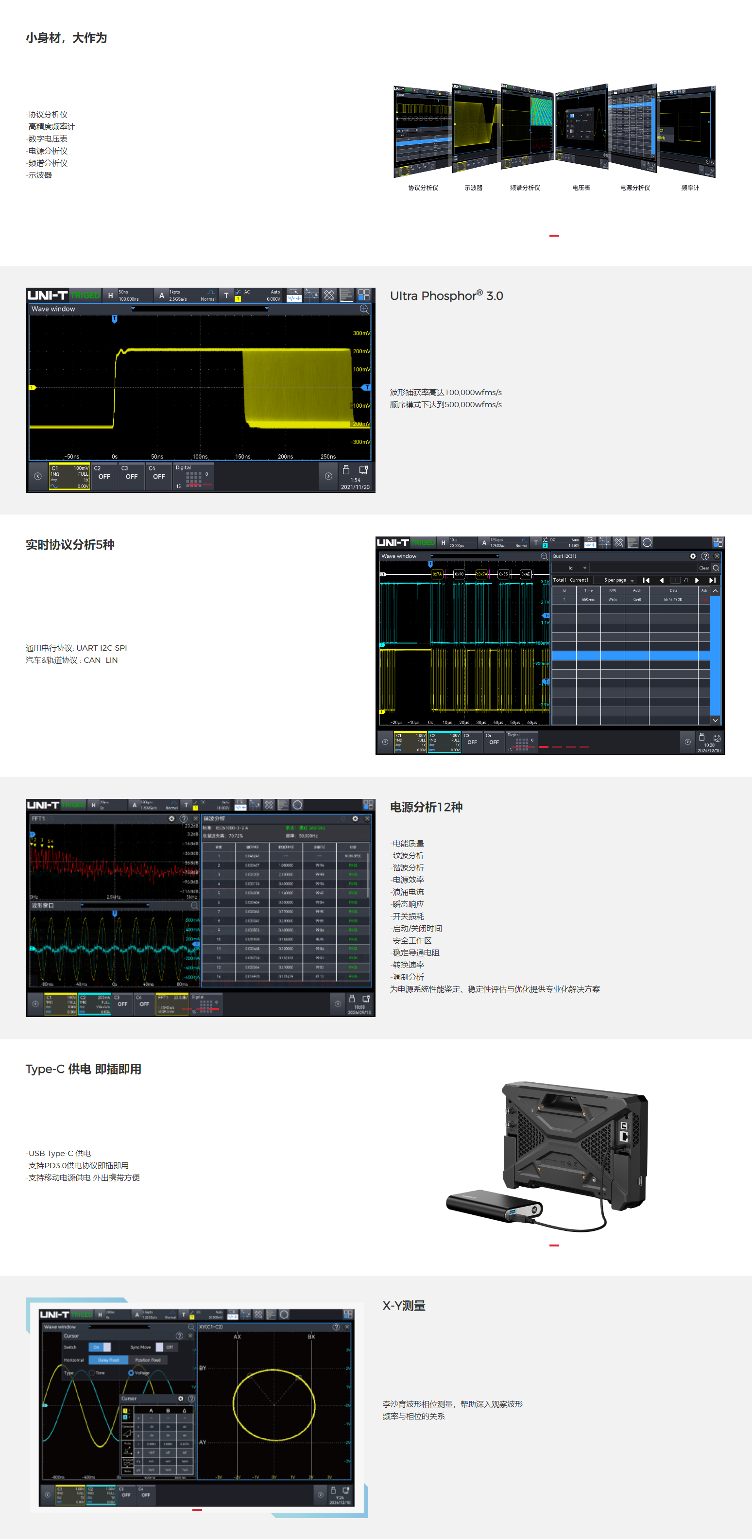 UPO6000HD-N是一款最多可选4通道高分辨示波器。其分辨率通过 ERES提升到16bits,确保信号分析的高精度。1.25GSa/s的最高采样率、100Mpts/CH存储深度和500,000wfms/s的波形捕获率, UPO6000HD-N能够精准捕捉并记录瞬态信号细节。内置12种电源分析和种5协议分析功能,通过WebServer实现远程控制,该示波器适用于教育行业、传感器,嵌入式开发,医疗器械和汽车维修等领域的多样化测试任务。