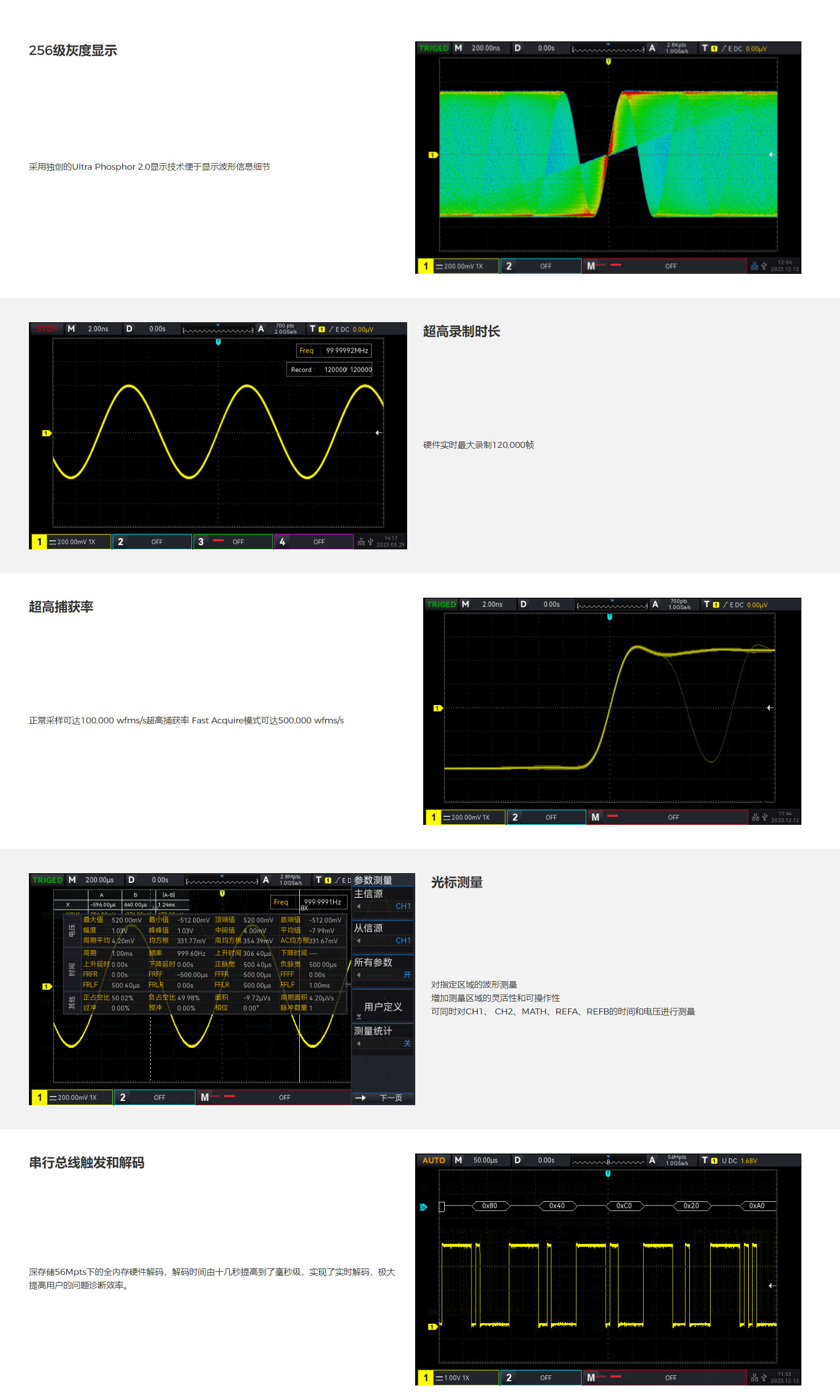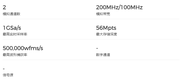 该系列示波器配置200MHz/100MHz 两种带宽,实时采样率高达1GSa/s,2个模拟通道,最大存储深度56Mpts,最大波形捕获率500,000wfms/s,硬件实时波形不间断录制和波形分析功能最大达120,000帧;支持DVM模块,拥有丰富的触发和总线解码功能,并支持全内存硬件实时解码。广泛应用于包括通信,半导体,计算机,集成电路设计,仪器仪表,工业电子,消费电子,汽车电子,现场维修,研发/教育等众多领域的通用设计/调试/测试。