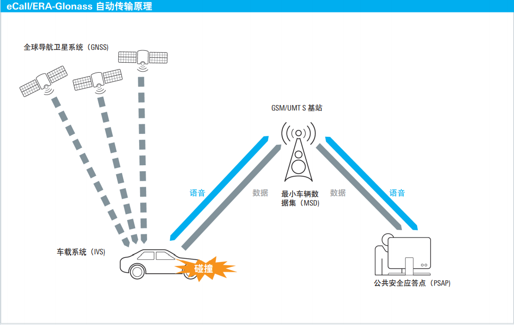 欧盟和俄罗斯联邦正致力于引入基于远程信息服务的智能 车辆安全系统,缩短紧急呼叫的响应时间,从而减少事故 伤亡和财产损失。eCall 和 ERA-Glonass 是适用于汽车的电 子安全系统,当发生严重交通事故时,安装了车载系统 (IVS) 后, 车辆会自动根据 IVS 触发 112 紧急呼叫以寻求当地急 救医疗服务,系统通过蜂窝通信网络传输标准化的最小数据 集 (MSD),此 MSD、涵盖乘客数量、事故发生时间和事故 发生的 GNSS 坐标等信息,如果车上有乘员能够说话,随 后将会建立语音连接。ERA-Glonass 与欧洲 eCall 标准相一 致,但其指定了一些扩展功能,以便更好地支持俄罗斯的基 础设施。这些扩展包括用于 MSD 传输的附加 SMS 短信服 务 功能,以防带内数据传输失败。作为安全系统,带内调 制解调器必须高度可靠而且能够准确传输 MSD。 针对优化后的 GSM 和 WCDMA 等蜂窝通信网络所进行的 语音传输尤为重要。测试 eCall 和 ERA-Glonass 的系统组 件很容易变得耗时、成本高昂而且非常困难。而且,由于环 境条件可能变化,所以很难得出重复的测试结果。