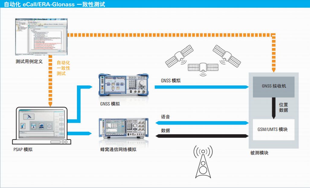 针对 eCall 和 ERA-Glonass 模块端到端的可重复性和标准 认证的一致性测试,罗德与施瓦茨提供一套紧凑型的解决 方 案。R&S®CMW-KA094 eCall 应用软件和 R&S®CMWKA095 ERA-Glonass 扩展模拟 PSAP( 公共安全应答点 ) 并 远程控制 R&S®CMW500,模拟实验室中的蜂窝通信网络, 该软件还可控制 R&S®SMBV100A 矢量信号发生器,用于 提供 IVS 编译 MSD 所需的 GNSS 坐标。例如,此装置可 用于验证 IVS 调制解调器能否触发紧急呼叫、发送正确的 原始 MSD 数据以及与 PSAP 建立语音连接,而不必使用现 实中的移动网络。